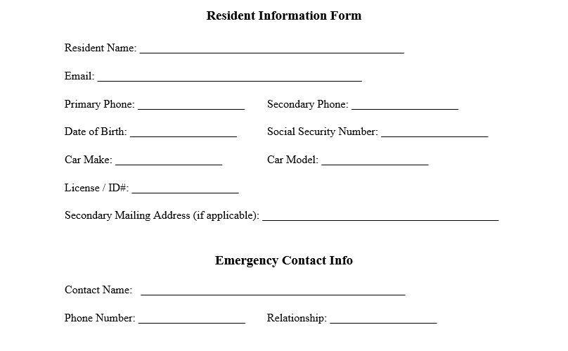 Some credit reports, or applications, will not provide all of the tenant’s information like their Social Security Number or vehicle information. These are valuable details to know — whether your property is an HOA that requires vehicle registration, or the resident has unpaid rent and needs to be sent to collections — so we recommend having the selected tenant (who you select to move into the property), complete a Resident Information Form like the one below.